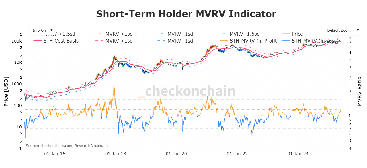 - Bitcoin’s unrealized profits indicator for short-term holders climbed to 27%