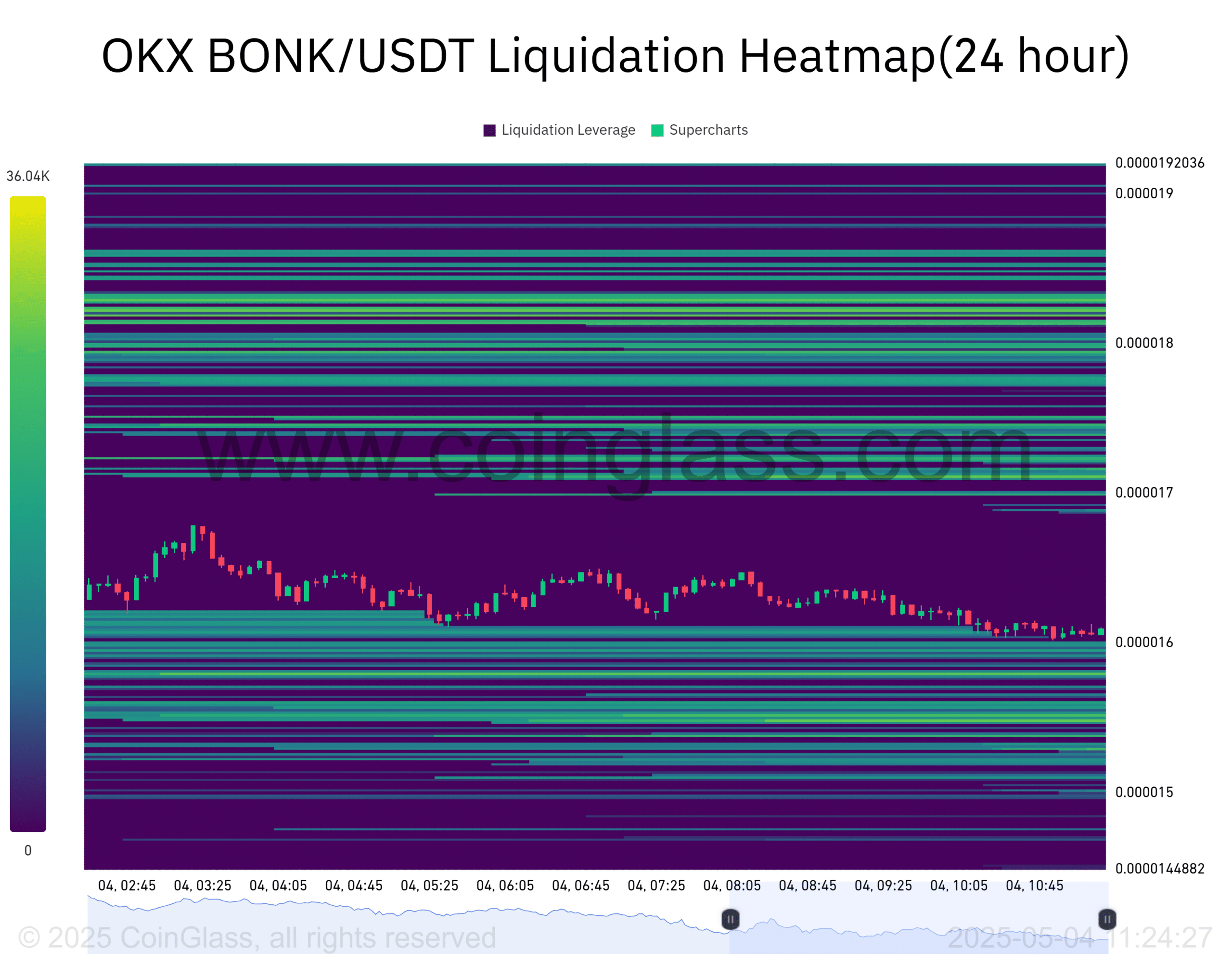 Analysis of the Liquidation Heatmap confirmed that BONK was hovering near dense lower-level liquidity clusters, specifically between $0.000016 and $0.00001448.
