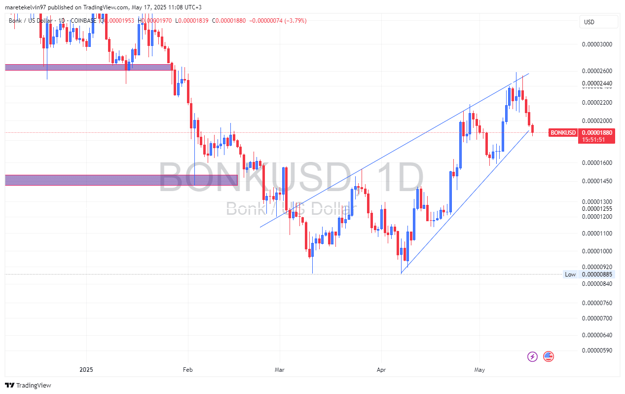 Historically, the chart pattern is considered a make-or-break moment. If support is maintained, BONK can bounce back. But if bears break through, the memecoin can dip further to test lower supports.
